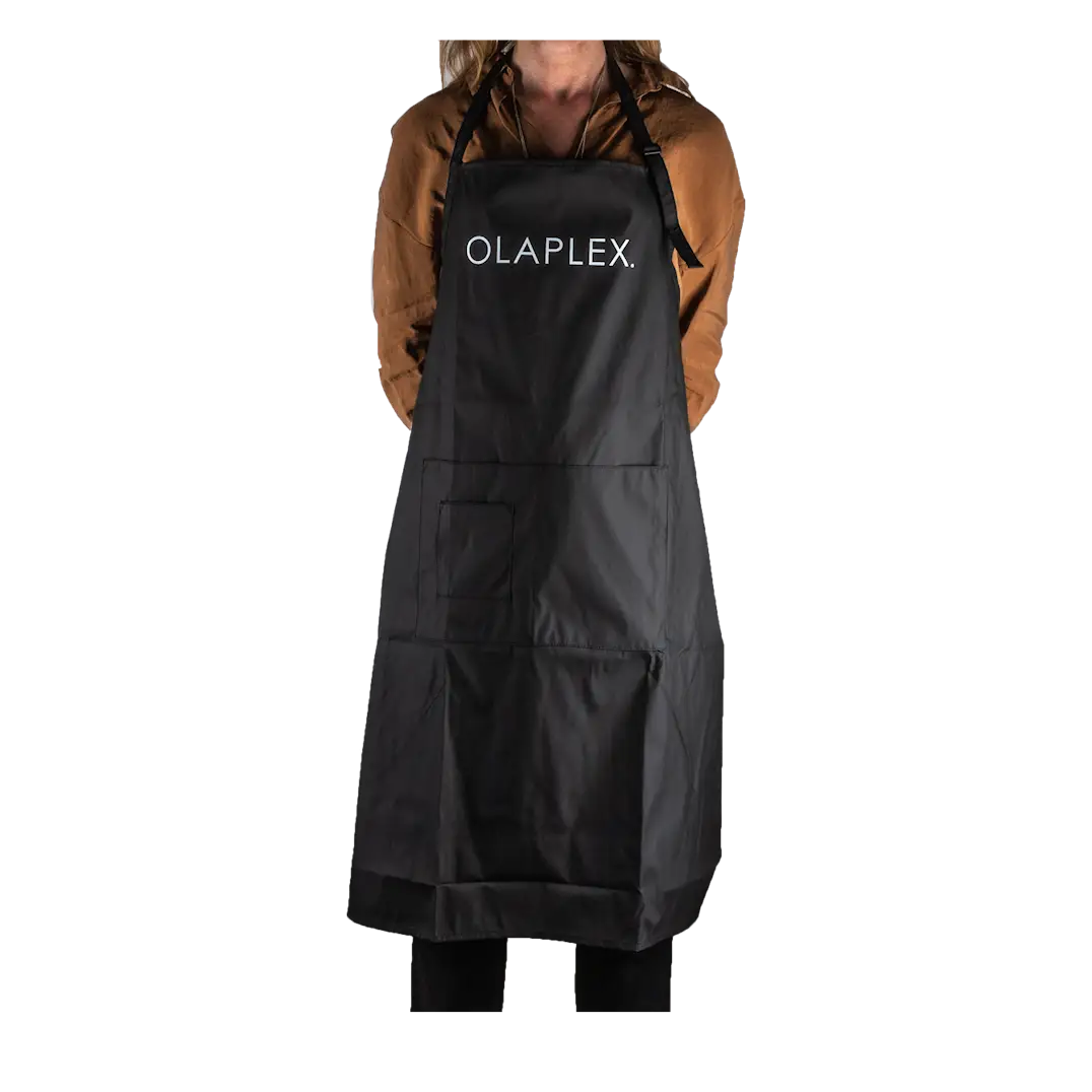 Langt, sort forklæde med stilrent Olaplex-logo og dobbelte lommer.