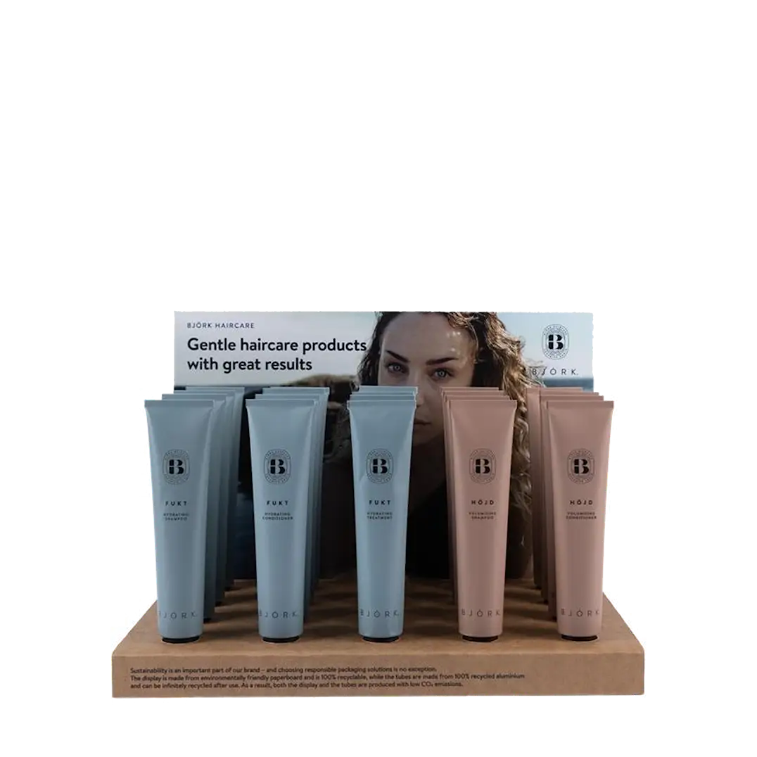 Bæredygtighed er en vigtig del af Björks identitet – og at vælge ansvarlige emballageløsninger er ingen undtagelse. Dette produktdisplay er fremstillet af miljøvenlig karton, som desuden er 100% genanvendeligt. Tuberne er lavet af 100% genanvendt aluminium og kan genanvendes uendeligt efter brug. Det betyder, at både displayet og tuberne er produceret med lave CO₂-udledninger, hvilket gør det til et meget bæredygtigt og miljøvenligt valg.