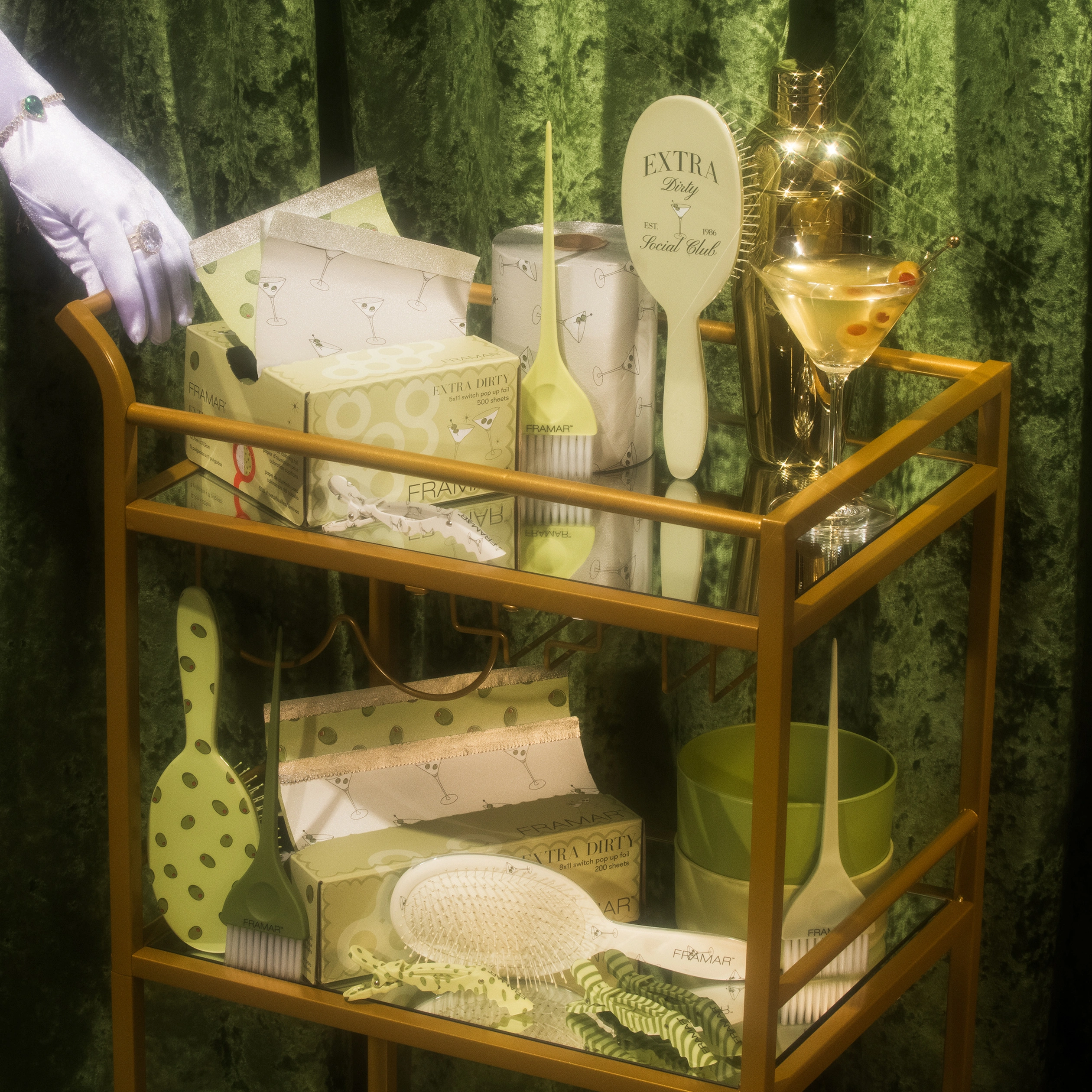 Alt fra folie og fargepensler til clips, bowls og detangle brushes – samlet i ett gjennomført konsept med martini-inspirert attitude.