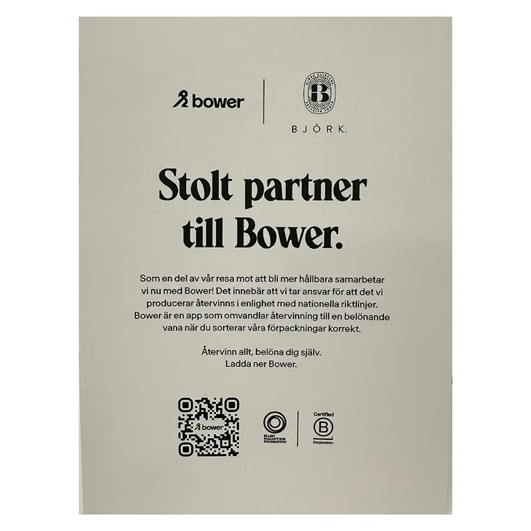 Som en del av vår reise mot å bli mer bærekraftig samarbeider vi nå med Bower. Det betyr at vi tar ansvar for det vi produserer i Björk blir resirkulert. Bower er en app som som belønner deg når du resirkulerer våre forpakninger riktig.