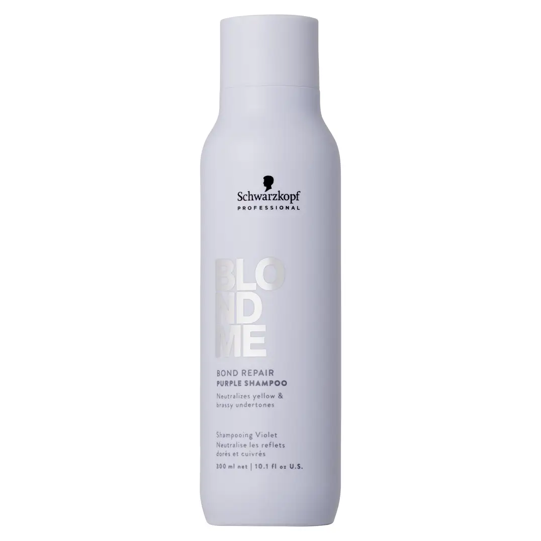 Purple Shampoo er en pigmentert shampoo for blondt og lysnet hår som fjerner varme undertoner. BLONDME Bond Repair Purple Shampoo med BOND REPAIR TEKNOLOGI nøytraliserer gule undertoner og hjelper til med å forhindre uønsket varme skjær, samtidig som den skånsomt renser og pleier håret. Den er beriket med mandelolje og kornblomst og opprettholder en frisk, kald tone og forbedre klarheten i den blonde fargen uten å endre hårfargen. Den gjenoppretter glans og styrker håret ved å bygge indre hårbindinger, og reparerer skade tilsvarende to bleke-behandlinger etter kun én gangs bruk.