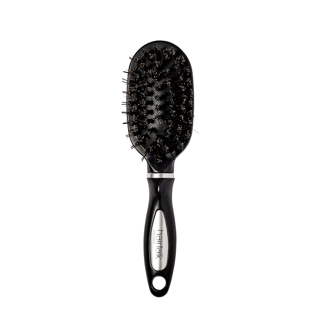Hairtalk Brush er laget med kortere naturbust og lengre syntetisk bust. Den rektangulære formen bidrar til å skape volum ved styling, og kombinasjonen av bust fordeler hårpleieprodukter jevnt gjennom håret og ut i lengdene der fuktighet trengs mest.