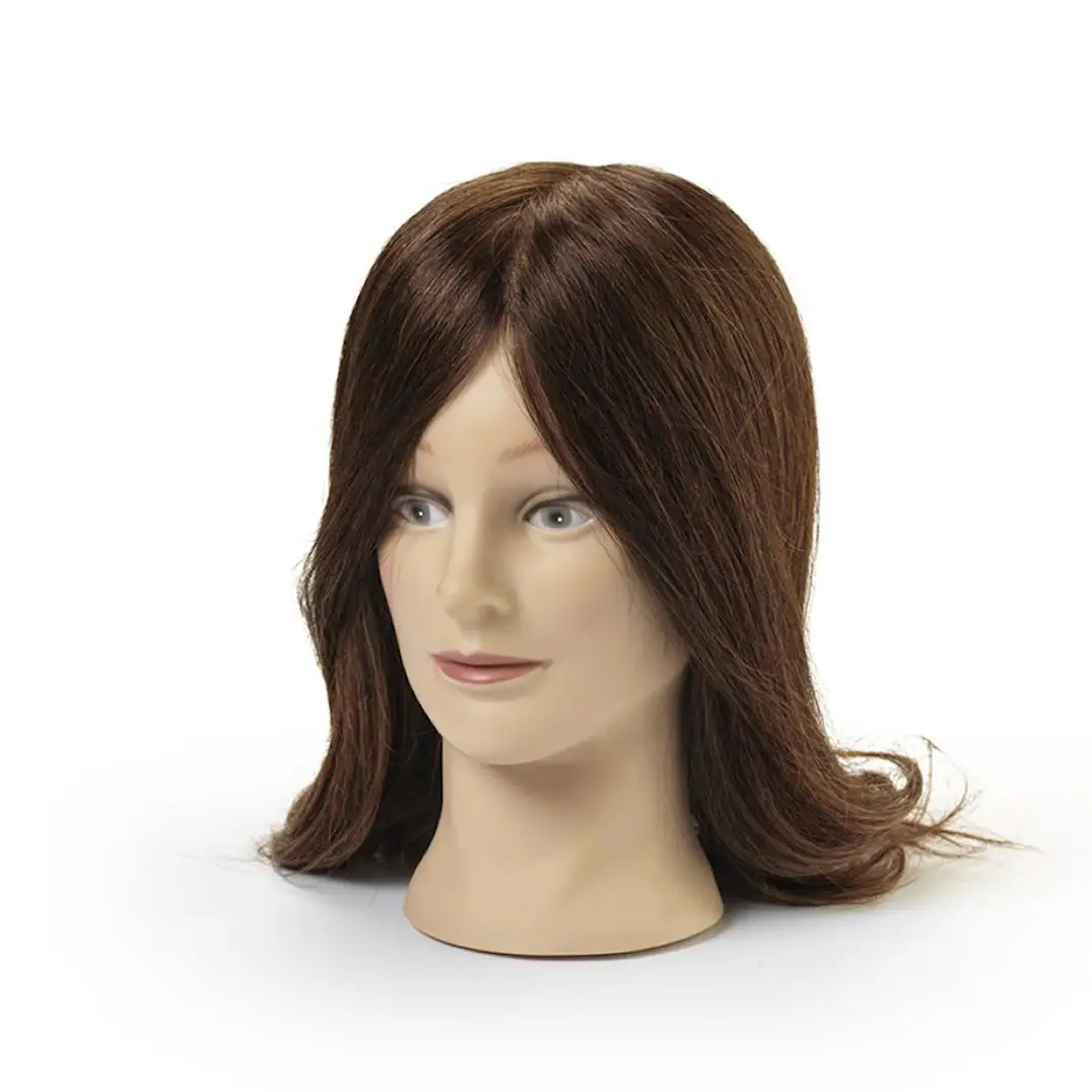 Mannequinhode med 100 % menneskehår, 30-35 cm, mørkebrunt. Dette mannequinhodet er perfekt for alle typer frisørtrening, inkludert permanent, farging og styling. 30-35cm, Dark Brown.