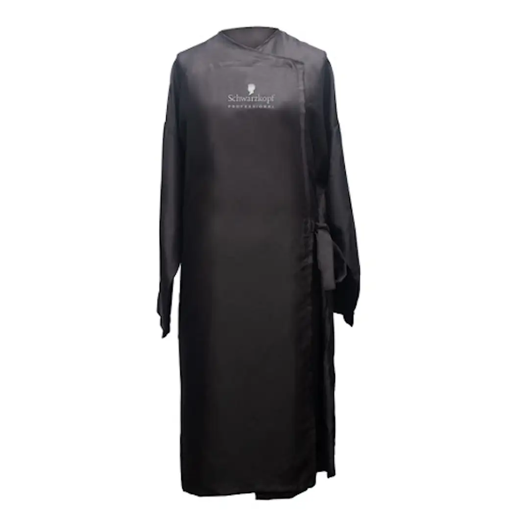 Sort kappe med hvit brodert Schwarzkopf Professional logo. Kimono med snøring i midjen, passer til både klippe- og fargbehandlinger.