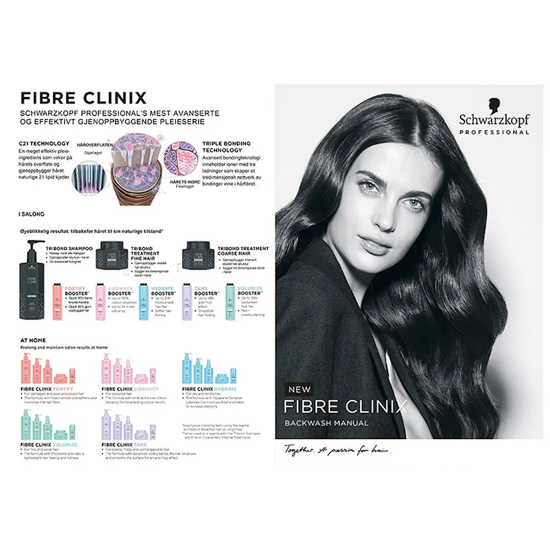 Fibre Clinix Plakat. A4-folder til shampooneringsområdet som forklarer produktene.