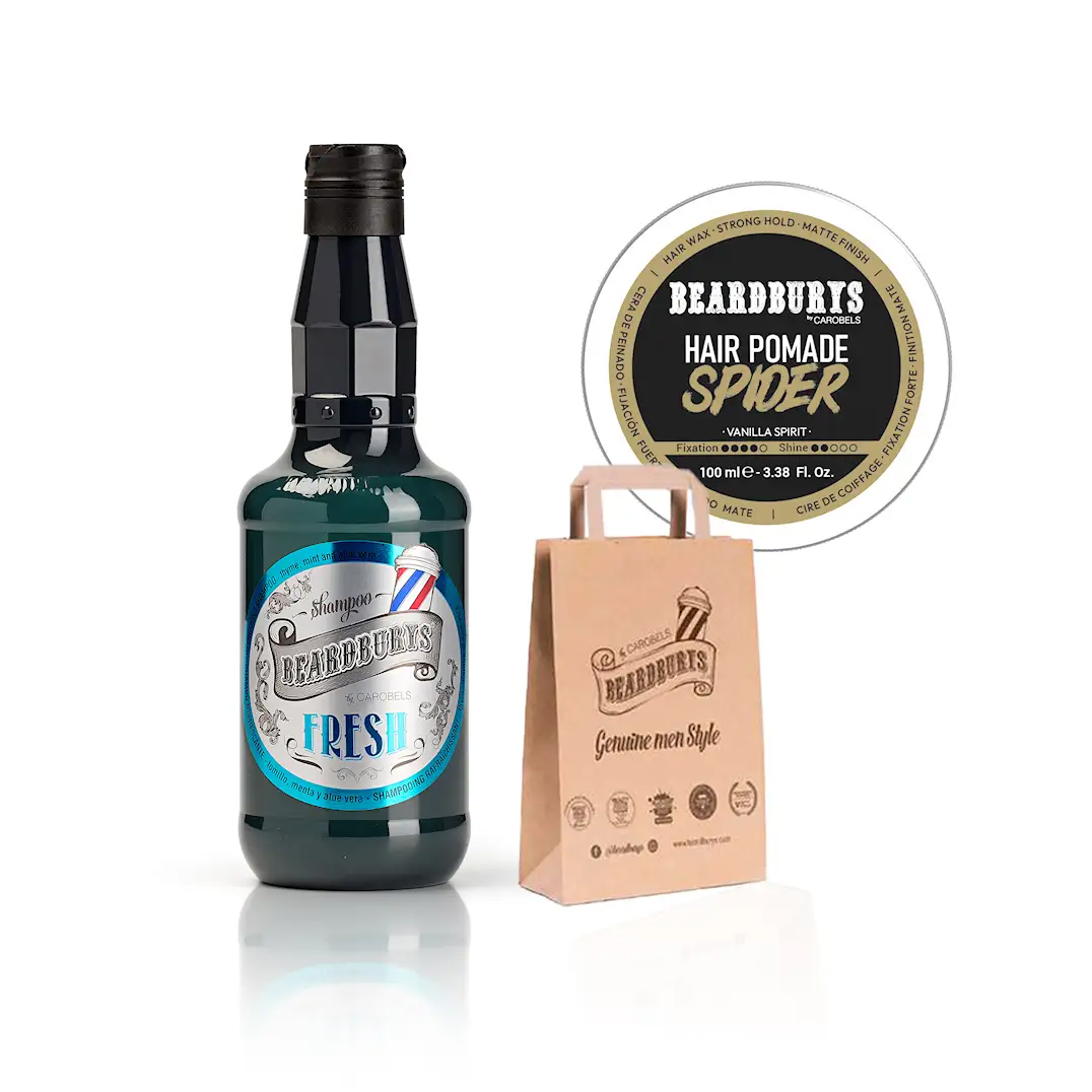 Fresh Shampoo gir en forfriskende følelse og ren hodebunn, mens Hair Pomade Spider gir fleksibelt, sterkt hold med naturlig glans. Nå med 30% rabatt – papirpose inkludert for videresalg eller gavepakking.