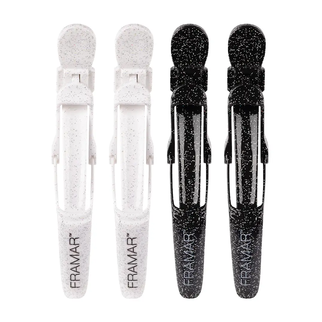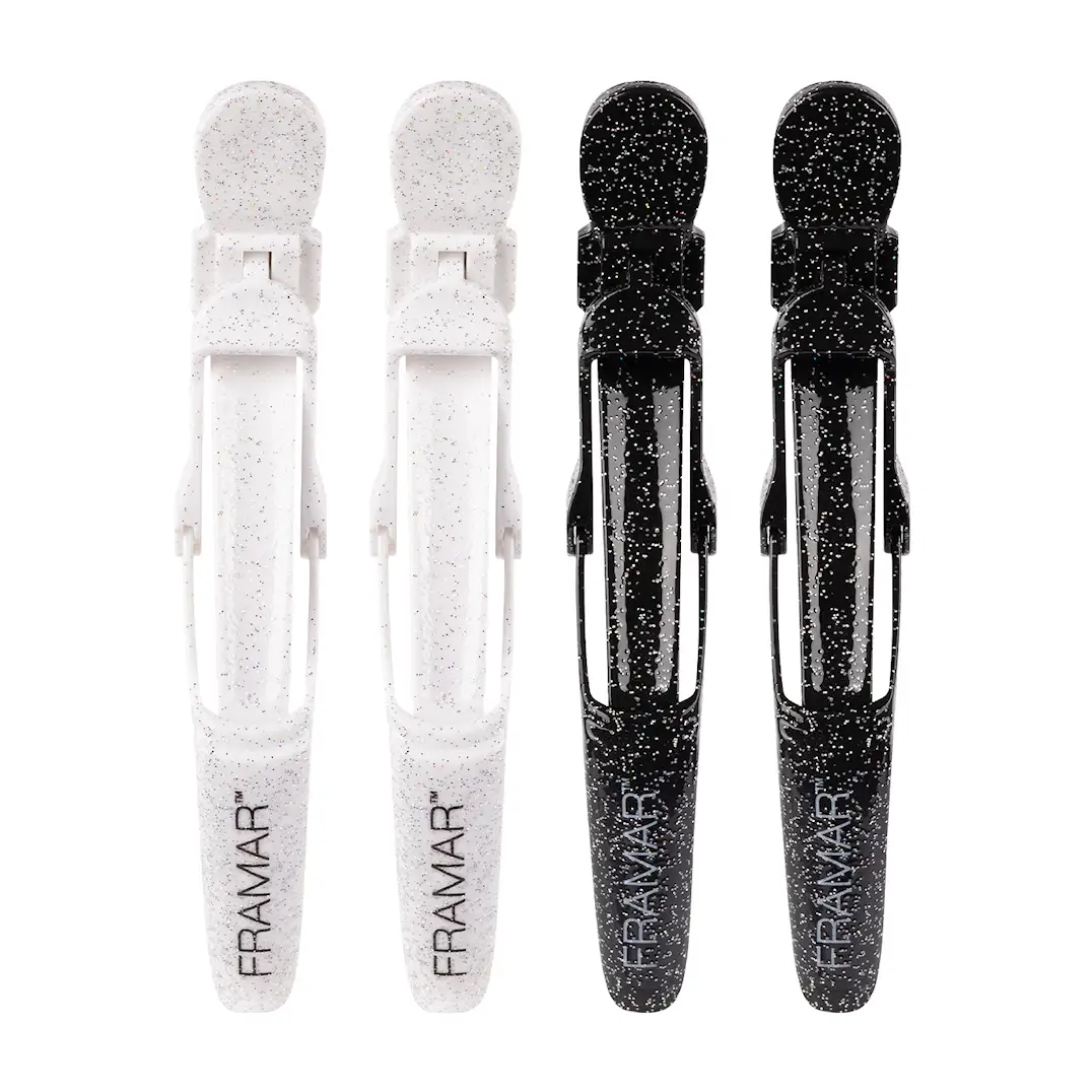Slitesterke Clips bøyer seg på to steder med industrielle rustsikre fjærer som holder store deler av håret bort uten at håret sklir. Rustfritt stål med godt hold. Passer i fint og tykt hår. Gummibehandlet tekstur gjør at du bare trenger å plassere hårklypen én gang, og den blir værende til du er klar til å fjerne den. Fungerer både vått og tørt hår. 4 Clips per pakke.