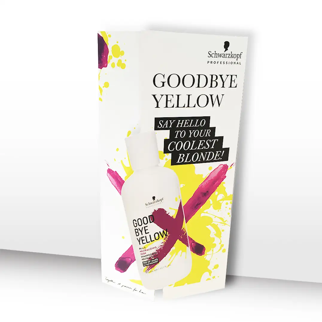 Goodbye Yellow kundebrosjyre. Viser hvordan kunden skal bruke Goodbye Yellow shampoo hjemme. 25 pk.