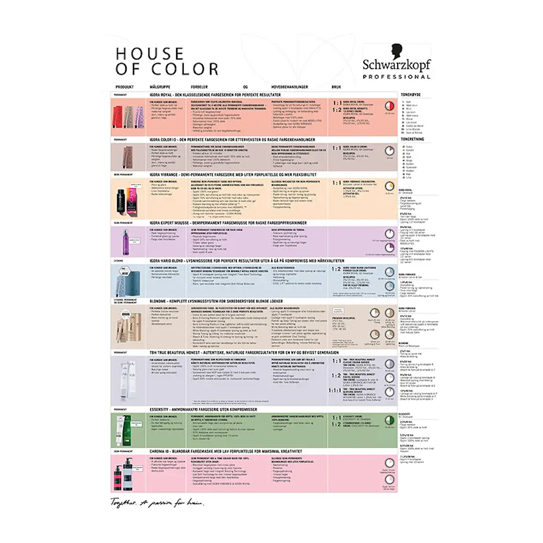 Oversikt over hele fargespekteret til Schwazkopf Professional. Inneholder hvilke kunder fargen er egnet for, fordeler, blandingsforhold, virketider, nyanseinformasjon mm.