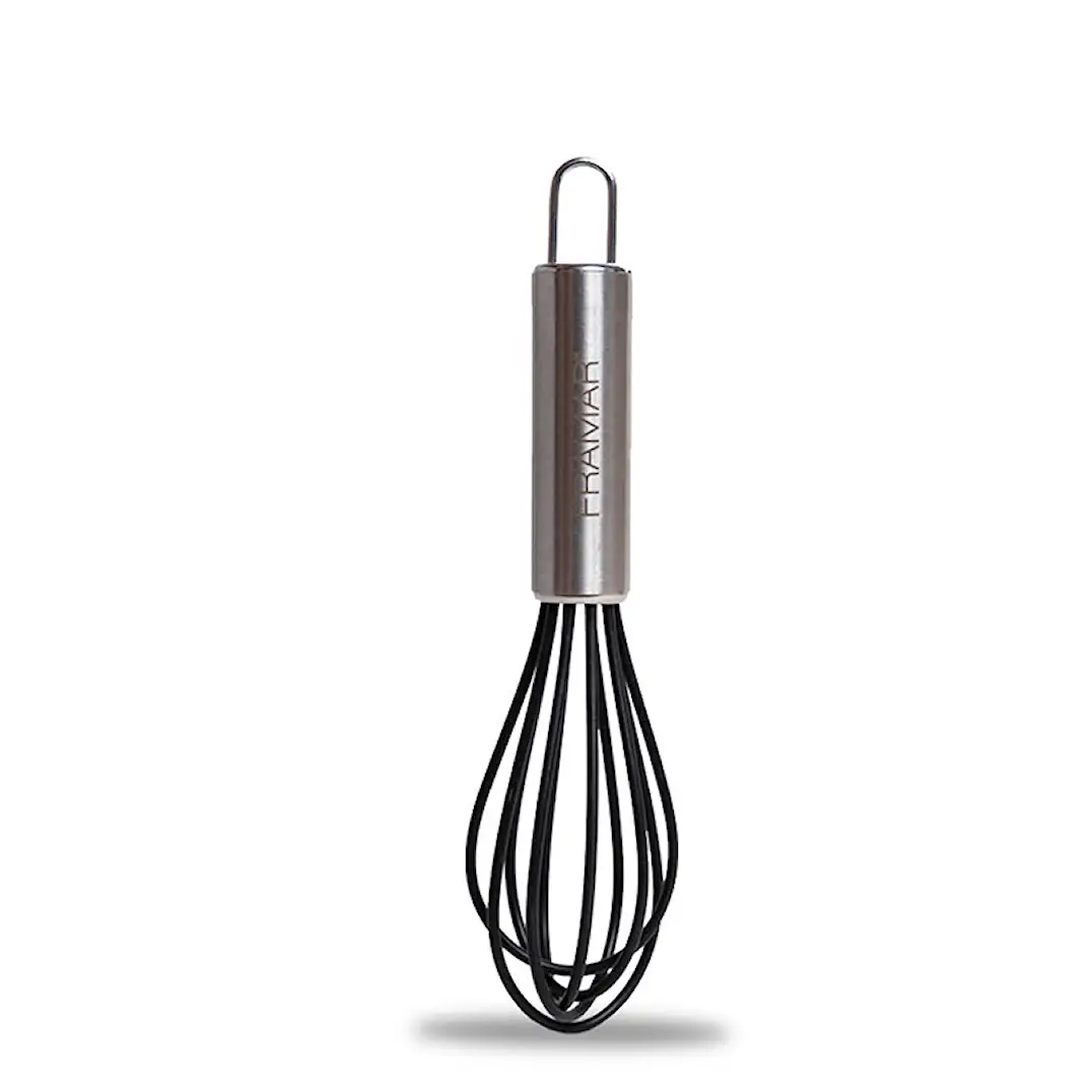 Mikser med håndtak i rustfritt stål og gummierte løkker. Blander farge og blekemiddel raskt og enkelt. Liten og kompakt, og tar ikke for mye plass.