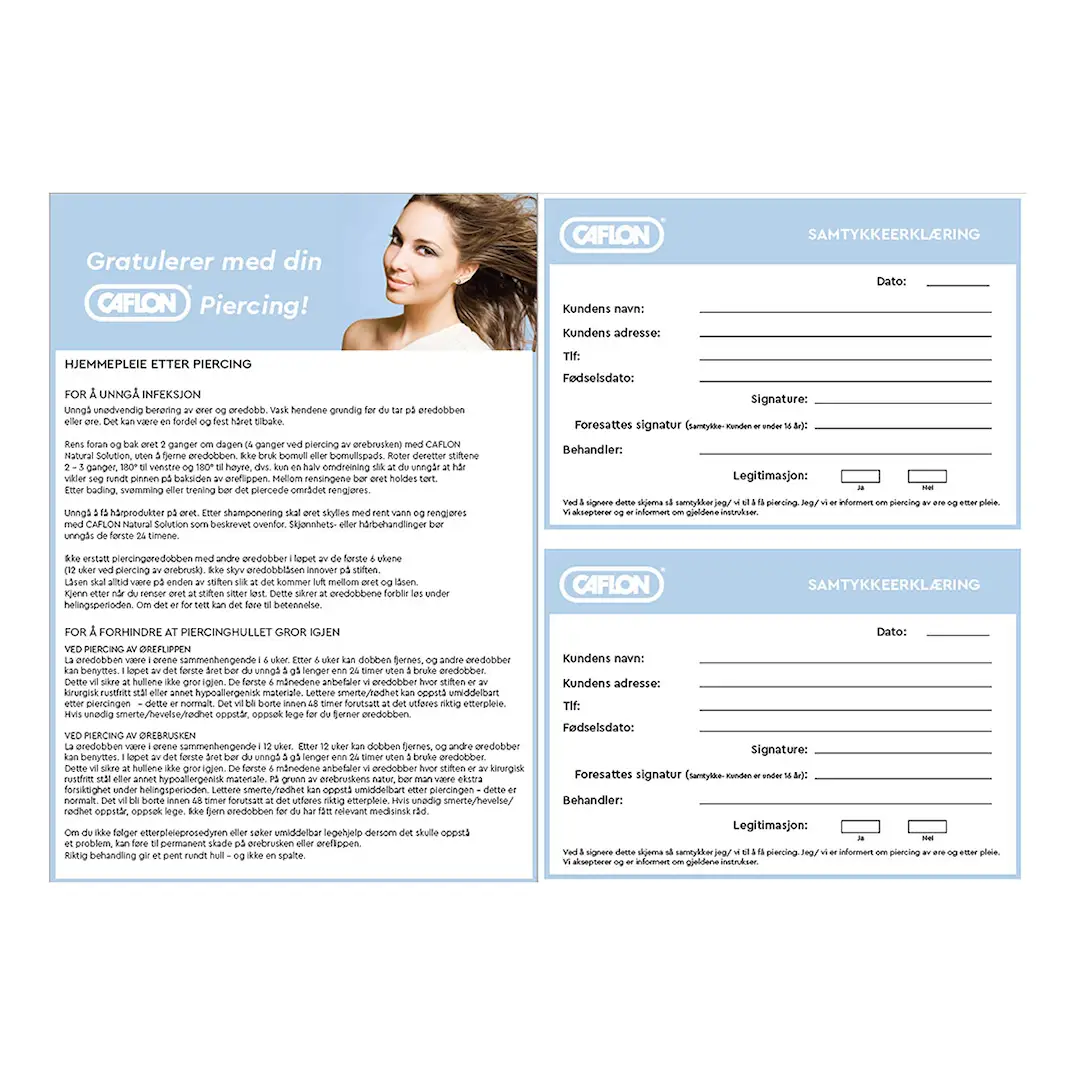 Samtykkeerklæring til salongen og informasjonark til kunden om hvordan best pleie piercinging hjemme.