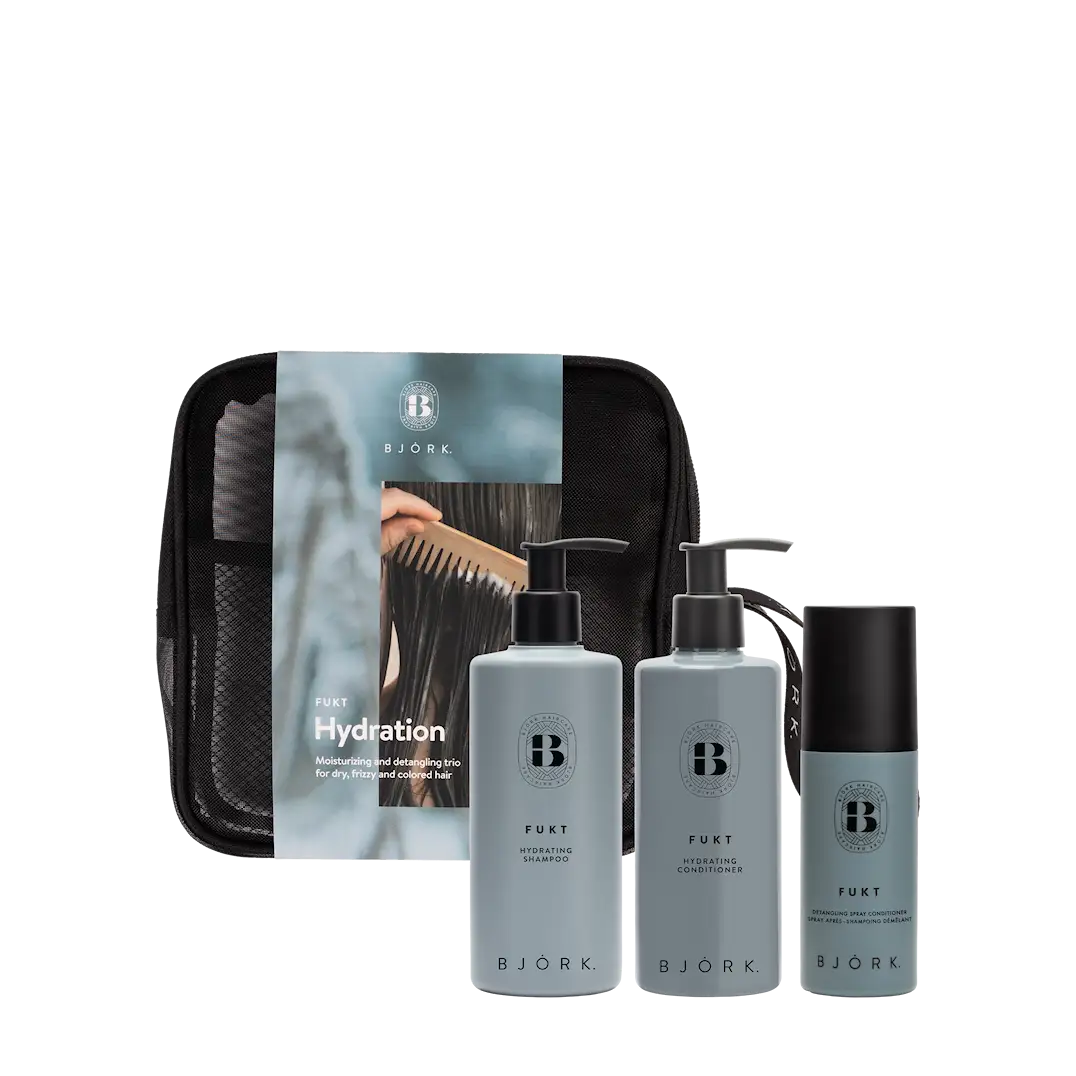Fuktighetsgivende og mykgjørende trio for tørt, frizzy og farget hår. Fukt Hydrating Shampoo, Conditioner & Spray Conditioner