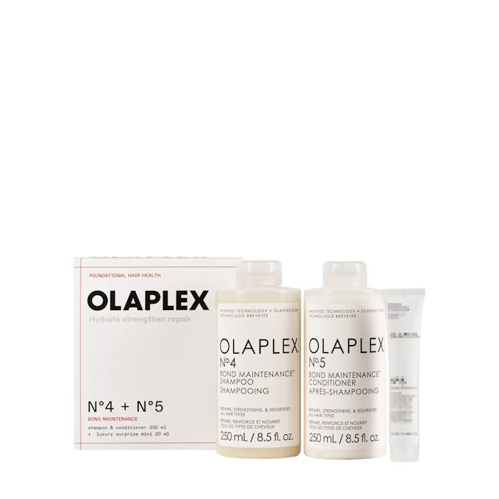 Köp box med Olaplex No4 Shampoo 250 ml & No5 Conditioner 250 ml – få en 20 ml surprise mini.