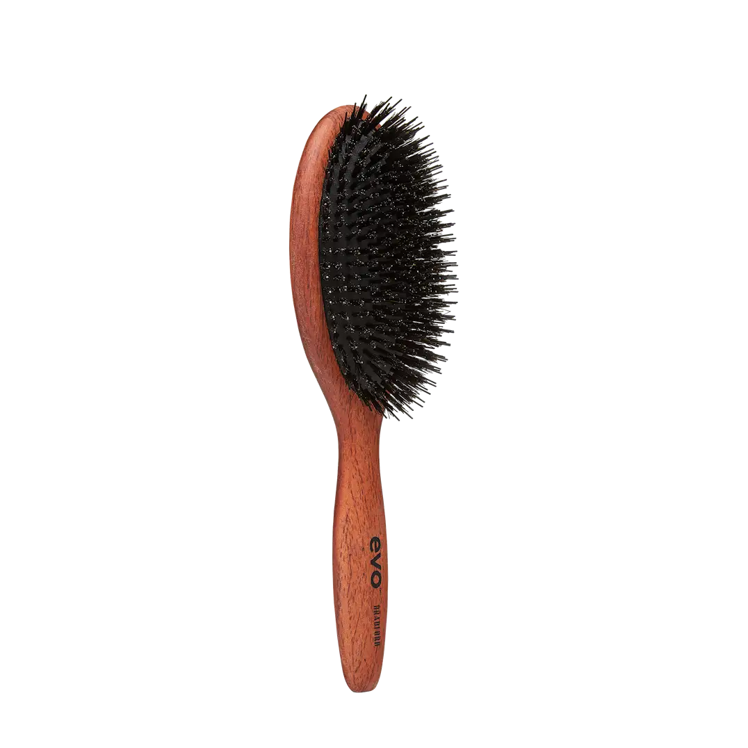 Tillverkad med en kombination av både svinborst och nylonpinnar. Innehåller naturlig svinborst som hjälper till att bibehålla hårets hälsa. Svinborst ger glans och en slät yta genom att fördela ut hårets naturliga oljor längre ut på håret. Detta hjälper till att reparera torrt hår och ge glans. Nylonpinnarna tränger djupt in, vilket hjälper till att reda ut och släta ut håret. Passar alla hårtyper, särskilt långt, tjockt, vågigt och lockigt hår. Alla Evo-hårborstar och kammar tillverkas med omtanke för miljön. Varje borste är tillverkad av FSC®-certifierat trä från välskötta skogar.