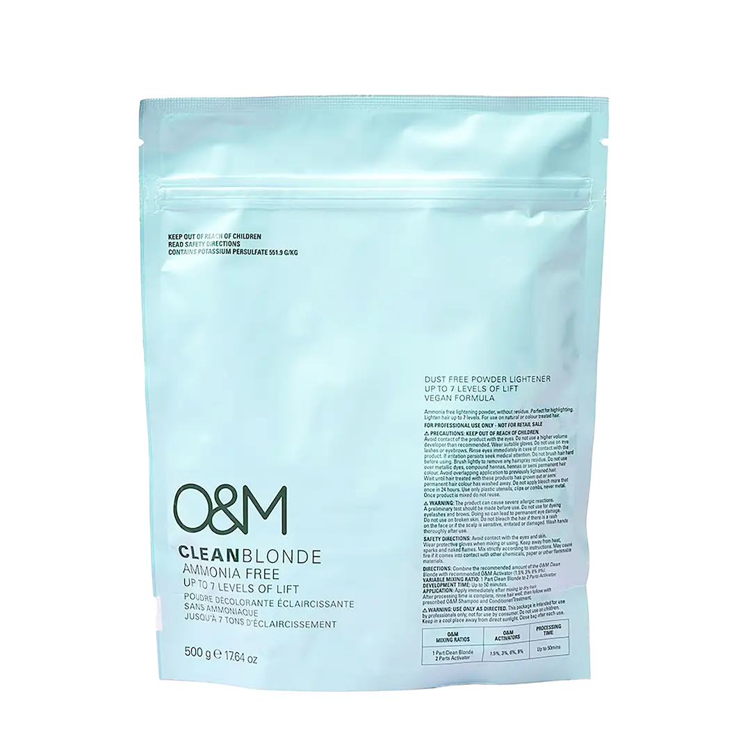 En ammonaikfri pulverblekning som ger upp till 7 stegs lyft. Formulerad med arganine. solrosfröolja och hydroliserat havreprotein för att bland annat förhindra förlust av fukt och skydda håret. Blandas med O&M väteperoxid 1, 1,5, 3, 6, eller 9%. Blandningsförhållande 1:2. verkningstid upp till 50 minuter.