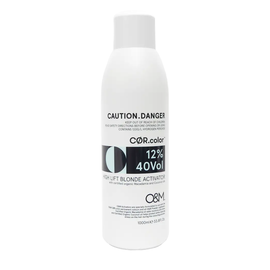 Väteperoxid 3,5 vol - 1% blandas med O&M Cor.color och O&M blekningar. Innehåller O&M:s egna signaturblandning av oljor - kokos och makadamia som hjälper färgen att tränga in djupare i hårstrået och ger en mer hållbar färg. Oljorna hjälper också till att vårda håret under färgning och gör det enklare att reda ut.