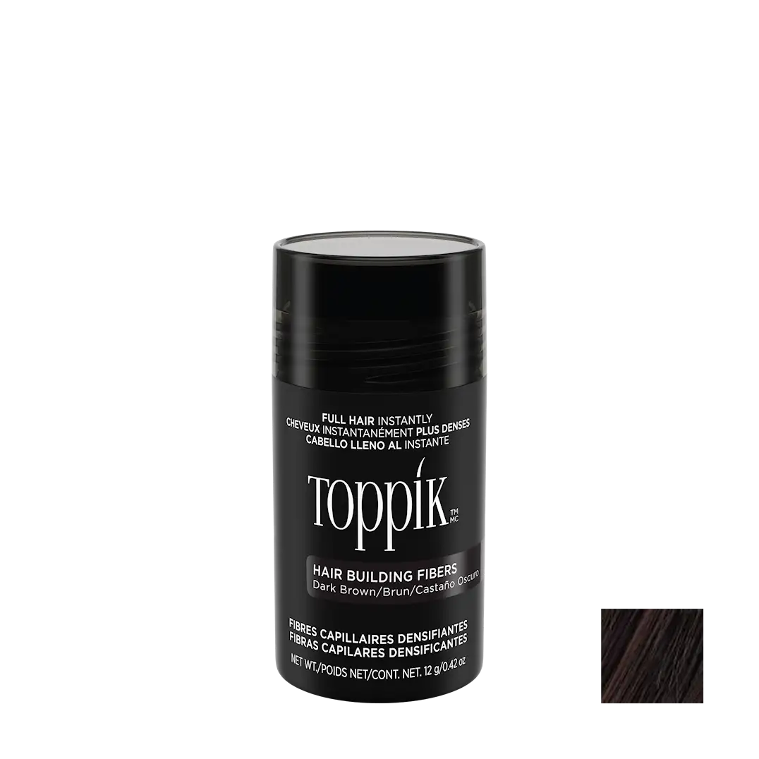 Toppik Hårfiber döljer tunnhårighet och håravfall. Organiskt keratin från naturligt ullhår fäster sig i det befintliga håret och gör att det ser mycket tjockare och tätare ut.