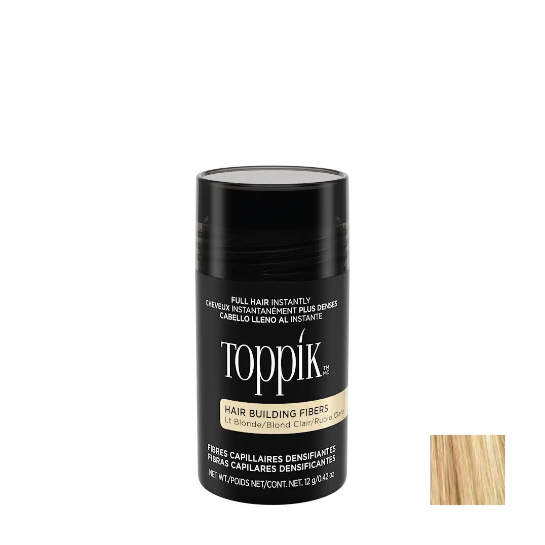 Toppik Hårfiber döljer tunnhårighet och håravfall. Organiskt keratin från naturligt ullhår fäster sig i det befintliga håret och gör att det ser mycket tjockare och tätare ut.