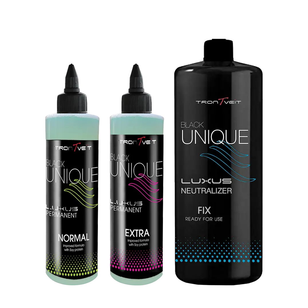 Black Unique Permanent har en unik sammansättning som skonsamt bearbetar bindningarna i håret istället för att bryta dom. Med denna formula behåller lockar sin studs och håret bibehåller sin hälsa. Black Unique är baserat på cystamin istället för traditionell ammoniak och tioglykolsyra, Slitaget på håret blir markant reducerat och behandlingen ger perfekt resultat varje gång. Normal kommer med en mild doft av äpple.